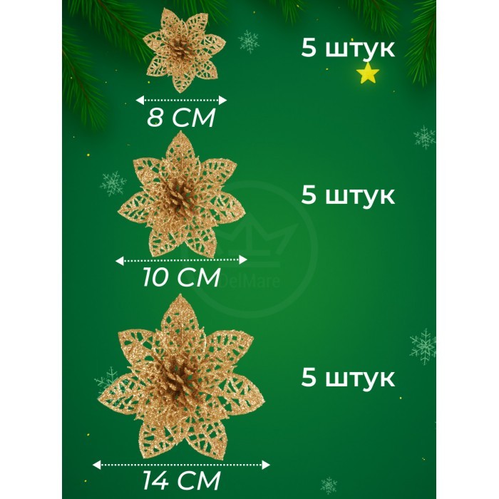 Набор Цветы Пуансеттия (15 штук - 8см-5шт/10см-5шт/14см--5шт+зажимы 15шт) золото 266224